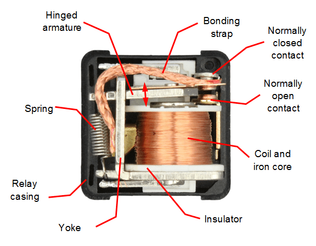 Tùy theo loại rơ le (rơ le trung gian, rơ le nhiệt, rơ le điện từ…), cấu tạo có thể khác nhau, nhưng nhìn chung gồm 4 phần chính: